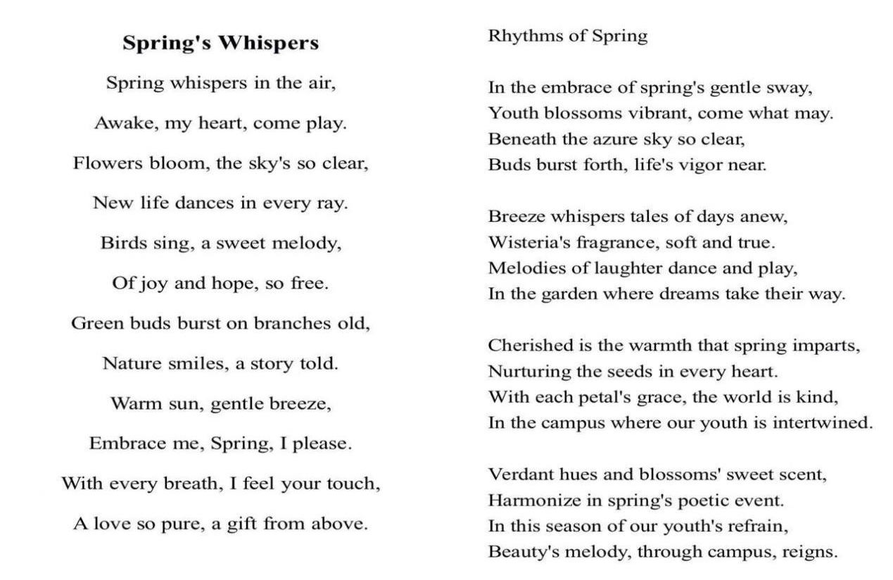 同学们以“春日美景、春日向往与热爱”为主题,创作含有春天元素的中英文原创诗歌,用文字描绘春天的生机活力,抒发内心的情感与思考,一首首诗歌如春风拂面,展现了同学们的文学才华与青春风采。其中《Spring's Beauty, Longing, and Passion》《苏醒于春,盛开在光》《Rhythms of Spring》《Spring's Whispers》等四首诗歌脱颖而出,获得了一等奖。