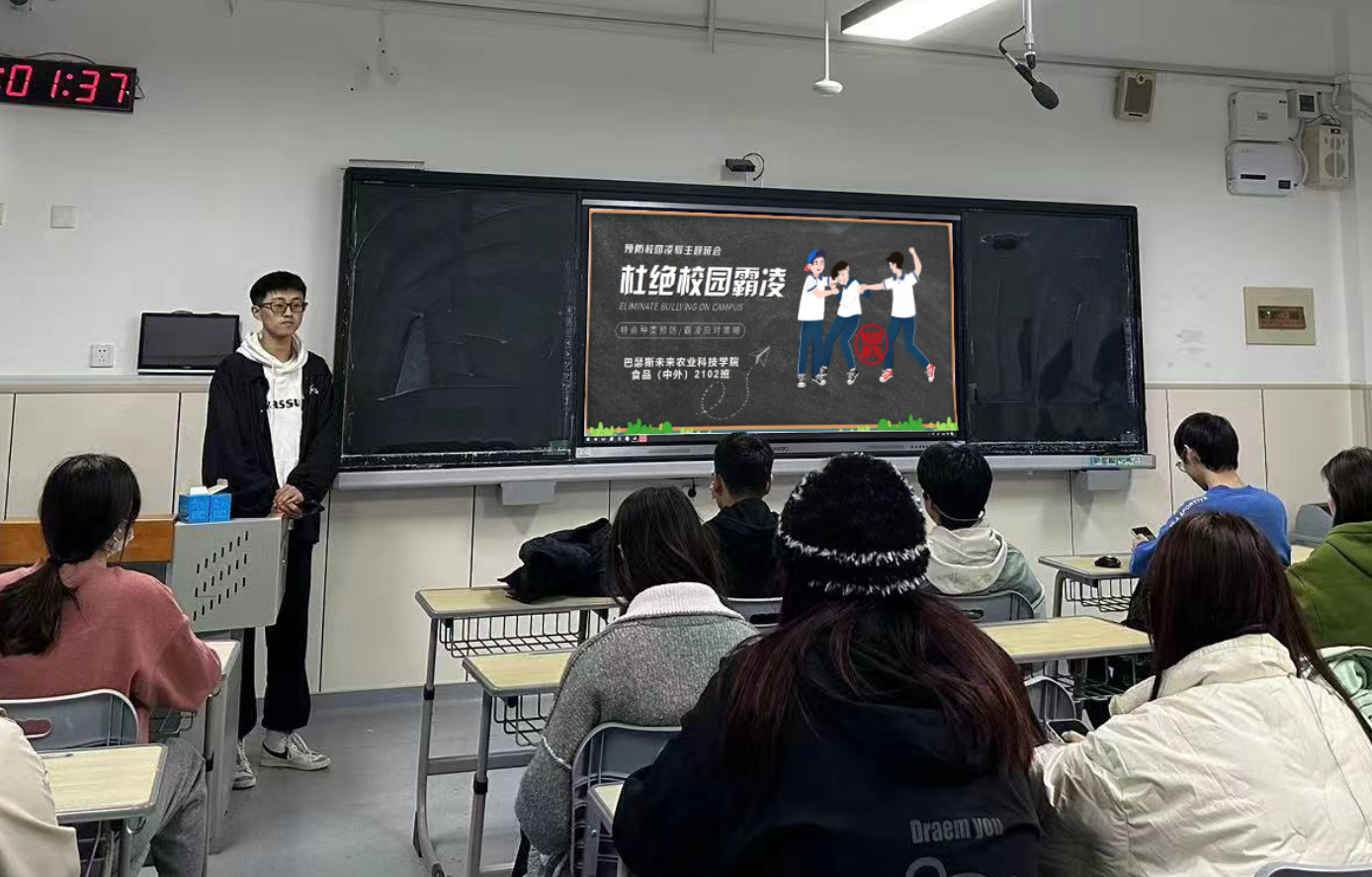 为帮助同学们增强自我保护意识,构建和谐班级和宿舍氛围,10月11日,beat365亚洲体育官方网站于教学楼G区召开杜绝校园欺凌主题班会,班会由各班班长书记主持。