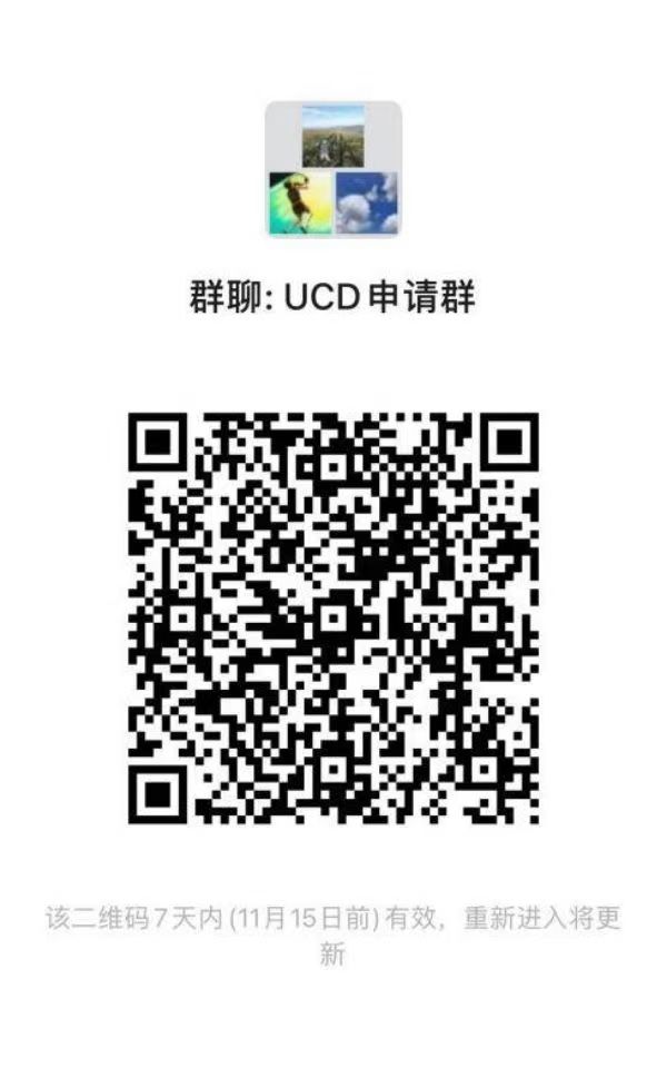 请有意向申请的同学,加入“UCD申请”微信群,入群之后将个人名片改为:姓名+申请专业+手机号。 专业申请相关疑问,将统一在微信群解答。微信群二维码:
