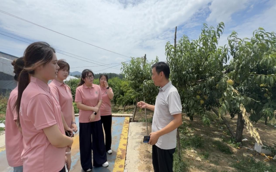实践团队穿梭于桃园,学习黄桃种植生长情况,了解黄桃产业基本概况,并虚心向农技人员请教种植技术。据了解,武台镇黄桃种植产业形成了涵盖种植、仓储、物流的完整产业链,降低黄桃生产成本,大幅提高产业生产效率,有效增强黄桃产业竞争力。同时,团队注意到,当地不仅通过优化种植模式、改良品种等提升黄桃品质,还引入了物联网监测系统,实时调控土壤湿度和光照,真正将“科技赋能农业”落实到田间地头。